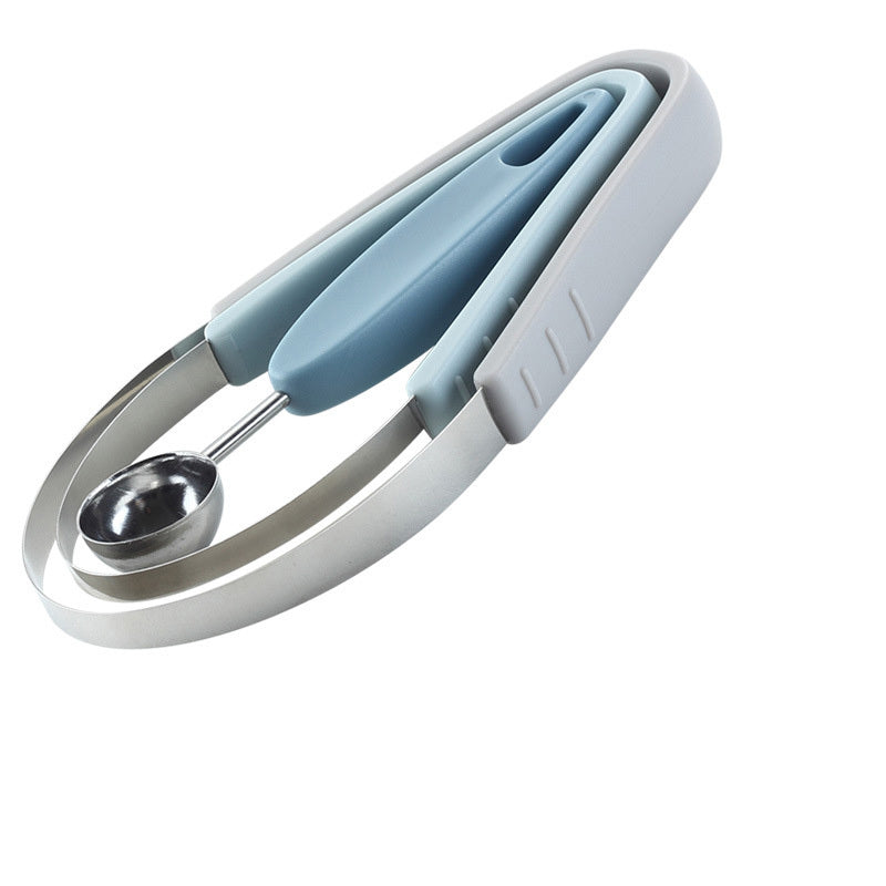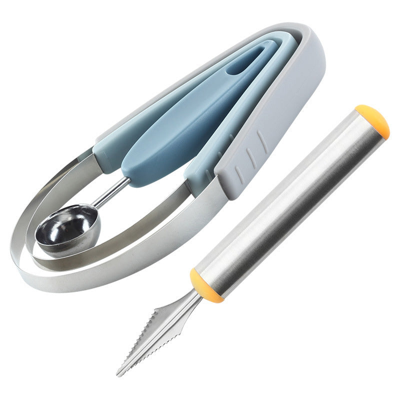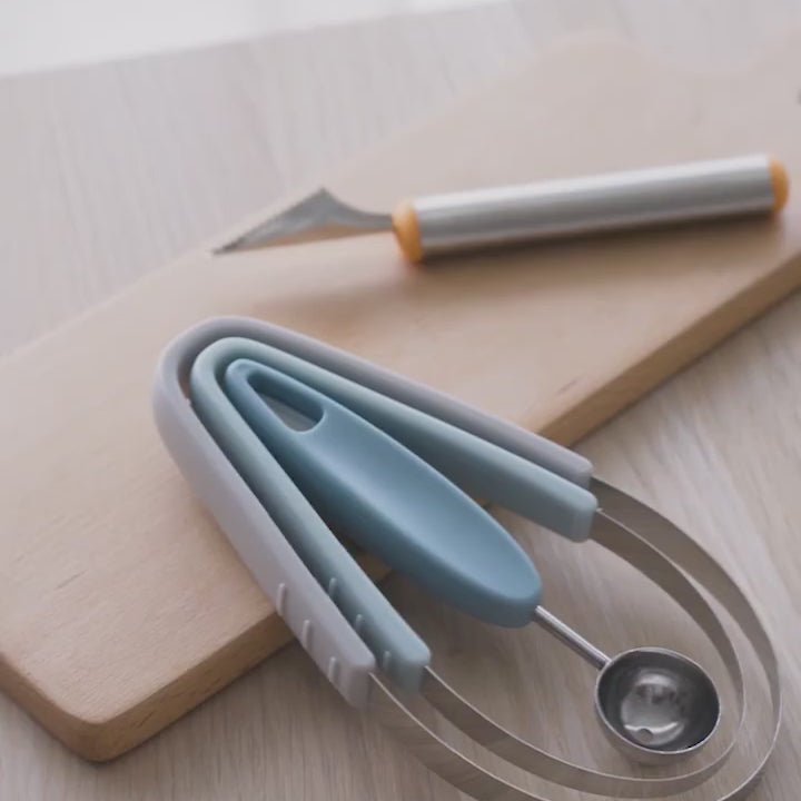 Multifunksjonelt design – én side for å lage runde frukt- eller iskuler, én for å skrelle enkelt, og én for dekorativ utskjæring.