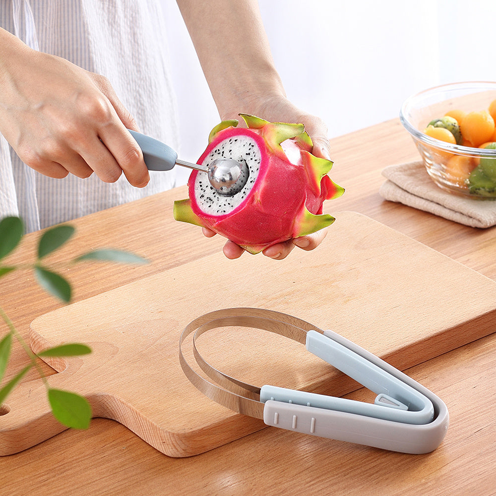 Dobbeltfunksjonelt fruktverktøy – bølget skjæreside for dekorativ utskjæring, og en rund kuleformet side i rustfritt stål for å lage fruktkuler.